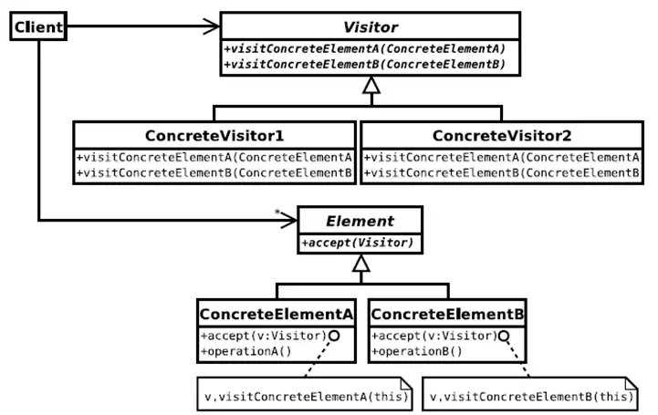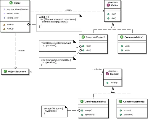 La idea básica es que se tiene un conjunto de clases elemento que conforman la estructura de un objeto. Cada una de estas clases elemento tiene un método aceptar (accept()) que recibe al objeto visitante (visitor) como argumento. El visitante es una interfaz que tiene un método visit diferente para cada clase elemento; por tanto habrá implementaciones de la interfaz visitor de la forma: visitorClase1, visitorClase2... visitorClaseN. El método accept de una clase elemento llama al método visit de su clase. Clases concretas de un visitante pueden entonces ser escritas para hacer una operación en particular.