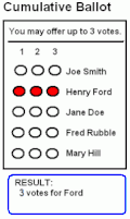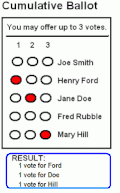 La circunscripción representada en la imagen adjunta tiene tres escaños por lo que el elector dispone de tres votos que puede distribuir de la forma que quiera entre los cinco candidatos presentados. En el primer caso, el elector ha decidido acumular los tres votos en Henry Ford; en el segundo, ha dado dos votos a Henry Ford y uno a Mary Hill; y en el tercer caso los ha repartido entre Henry Ford, Jane Doe y Mary Hill.