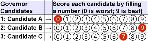 La votación por puntuación utiliza una boleta de puntuación ; es decir, cada votante califica a cada candidato con un número dentro de un puntaje específico, como 0 a 9[18] o 1 a 5. En el sistema más simple, todos los candidatos deben ser calificados. A continuación, se suman las puntuaciones de cada candidato y el candidato con la suma más alta es el ganador. Esto es más simple para los votantes que la votación acumulativa, donde no se les permite proporcionar puntajes para más de un cierto número de candidatos.
