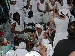 En el siglo XXI, varios grupos de vudú usan ropas blancas para sus ceremonias.[43] Influenciados por el vudú haitiano, los congregados pueden bailar alrededor de un poste central, el poto mitan.[44] Se pueden sacar banderas estampadas, denominadas drapos, mientras se cantan canciones en criollo haitiano.[44] También se pueden hacer dibujos, llamados vèvè, en el suelo para invocar a los espíritus.[45] Se brindan ofrendas a los espíritus.[46] Los ritos vudú contemporáneos a menudo implican invocar a los espíritus para que entren en el cuerpo de un practicante, a través del cual pueden curar o conferir bendiciones.[47] La persona poseída será llamado el «caballo».[46]