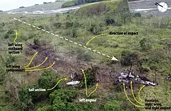 | Causa | Velocidad excesiva de la hélice con daños catastróficos en ambos motores por error del piloto lo que conllevó a un aterrizaje forzoso y vuelo controlado contra el terreno | |
