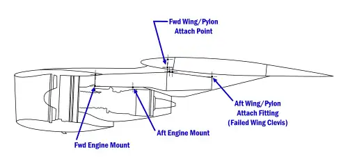 Durante la investigación, un examen de los puntos de fijación del pilón reveló daños en el soporte de montaje del pilón del ala, que coincidían con la forma doblada del herraje de fijación trasero del pilón. Esto indicaba que el herraje de fijación del pilón había golpeado el soporte de montaje en algún momento. Esta evidencia era importante, ya que la única forma en que el herraje del pilón podía golpear el soporte de montaje del ala de la forma observada era si se habían retirado los pernos que sujetaban el pilón al ala y el conjunto motor/pilón estaba sujeto a algo distinto a la aeronave. Por lo tanto, los investigadores pudieron concluir que el daño observado en el soporte del pilón trasero ya existía antes del accidente, y no fue causado por este.[1]: 18