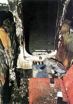 Tras esto, la sección anterior del chasis fue eyectada del motor, perforando uno de los tanques de combustible y posibilitando que el combustible fluyese libremente sobre el motor recalentado. Su combinación con el combustible que alimentaba al entonces dañado motor, provocó que este último acabase provocando la bola de fuego que envolvió al avión.