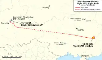 El avión partió del Aeropuerto Internacional de Kunming Changshui hacia el Aeropuerto Internacional de Guangzhou Baiyun a las 13:15 hora local (05:15 UTC).[7] Debía aterrizar a las 15:05 (07:05 UTC).[16] Según la CAAC, la aeronave perdió contacto con China Eastern sobre la ciudad de Wuzhou.[17] A las 14:22 (06:22 UTC), mientras se preparaba para descender a Guangzhou, la aeronave inició un descenso repentino y pronunciado, de 29.100 pies (8900 m) a 3225 pies (983 m) en 3 minutos con una velocidad de descenso de 8625 pies (2629 m) por minuto, según los datos de vuelo registrados por Flightradar24.[18] El avión finalmente se estrelló en las montañas del condado de Teng, ciudad de Wuzhou, provincia de Guangxi, a las 14:23 (06:23 UTC), y los restos fueron encontrados más tarde cerca del lugar del accidente.[7][19][1]