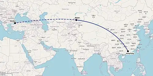 | Última escala | Aeropuerto Internacional de Manas, Biskek, Kirguistán | |