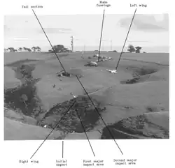 La caída del avión fue sobre una loma que se encontraba cerca de una pradera de pastoreo. Tras el primer impacto de la aeronave, las alas se separaron del fuselaje que avanzaron por la inercia cerca de 25 metros en direcciones opuestas, mientras el fuselaje tuvo un segundo impacto y quedó detenido en el centro de la pradera. El impacto mató a dos pasajeros que iban sentados con el cinturón de seguridad abrochado, una sobrecargo que al momento del impacto se encontraba de pie y un último pasajero murió semanas después en el hospital por sus quemaduras.