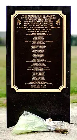 Christian Adams, Todd Beamer, Alan Beaven, Mark Bingham, Deora Bodley, Marion Britton, Tom Burnett, William Cashman, Georgine Corrigan, Patricia Cushing, Joseph Deluca, Patrick Driscoll, Edward Felt, Jane Folger, Colleen Fraser, Andrew Garcia, Jeremy Glick, Lauren Grandcolas, Donald Greene, Linda Gronlund, Richard Guadagno, Toshiya Kuge, Hilda Marcin, Waleska Martinez, Nicole Miller, Louis Nacke, Donald Peterson, Jean Peterson, Mark Rothenberg, Christine Snyder, John Talignani, Honor Elizabeth Wainio y Kristin White.