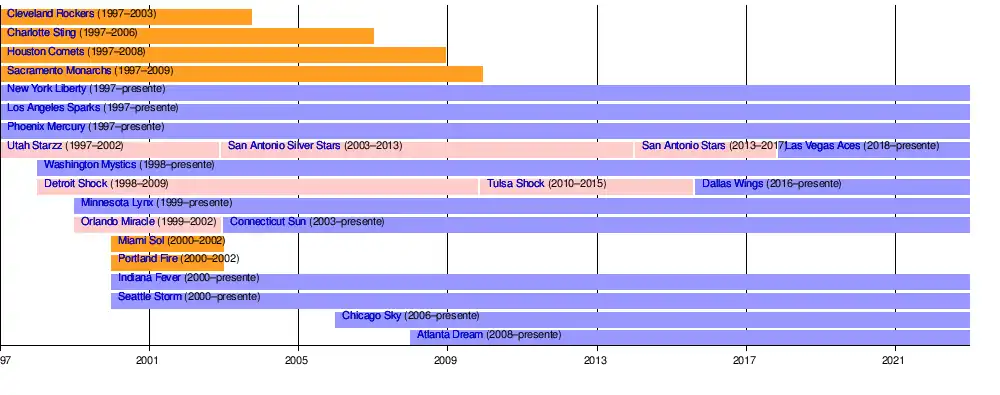 La WNBA se originó con 8 equipos en 1997 y, a través de una secuencia de expansiones, contracciones y reubicaciones*, actualmente consta de 13 equipos. Ha habido un total de 19 franquicias en la historia de la WNBA.