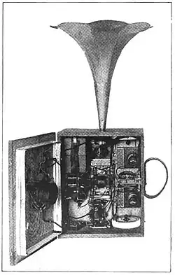 Junto con las transmisiones semanales a través de WWV, en mayo de 1920, el Bureau of Standards presentó el «teléfono portátil», con el que uno podía «recibir impulsos inalámbricos en forma de señales, música o voz, reproduciéndolos a través de un teléfono y una bocina».[12]