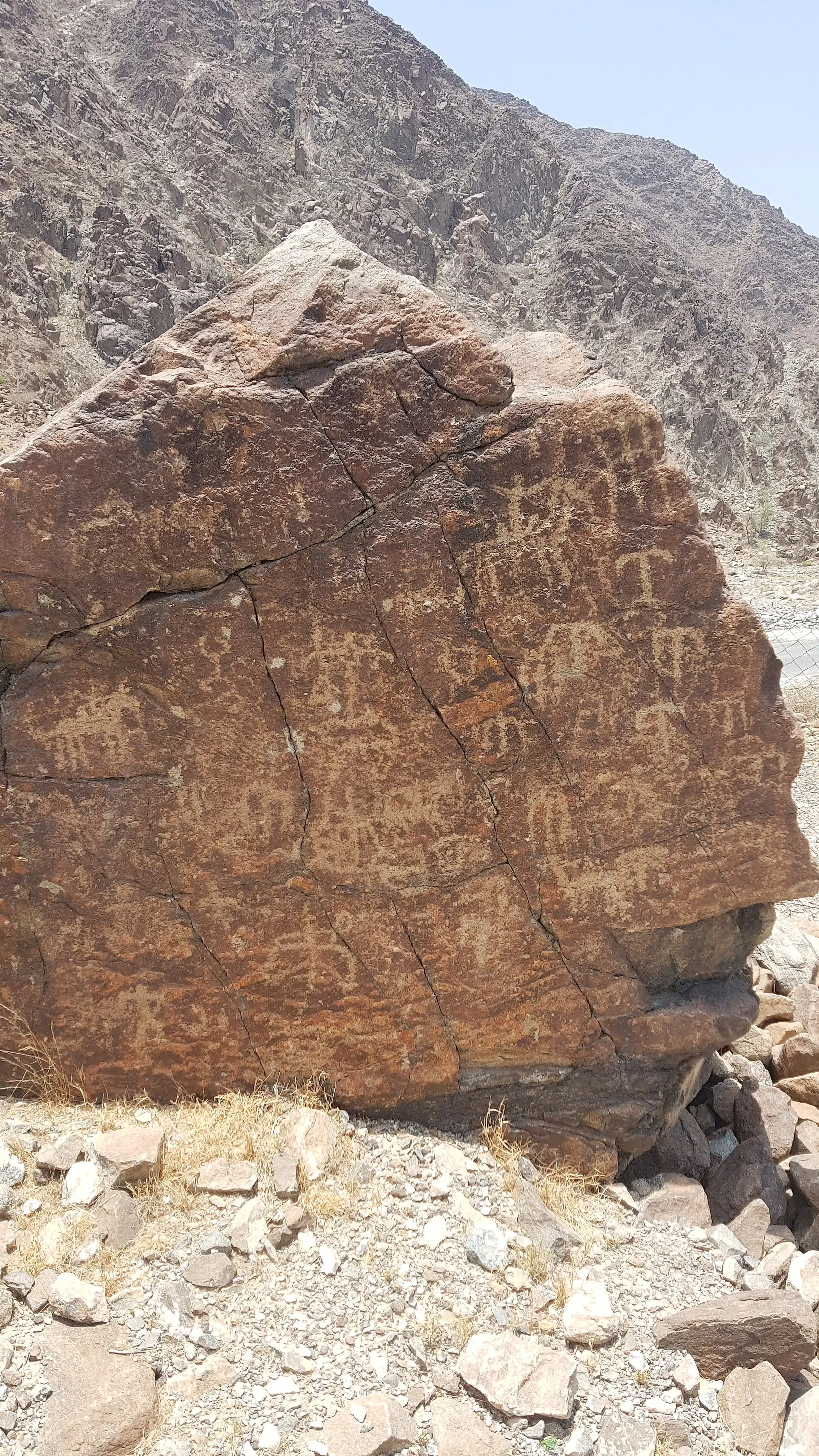 El conjunto de petroglifos más grande del wadi se concentra en una sola roca, al costado de la carretera, con una gran cantidad de jinetes representados, así como formas geométricas como la letra I e imágenes cruciformes.