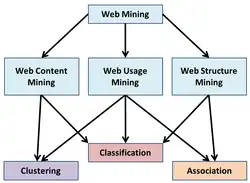 Web mining - es la aplicación de técnicas de minería de datos para descubrir los patrones de la Web. De acuerdo a los objetivos de análisis, la minería web se puede dividir en tres tipos diferentes, que son la minería de uso de la Web, minería del contenido de la Web y minería de la estructura de la Web.