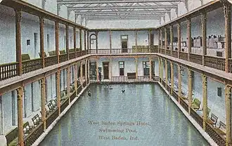 En 1887, Monon Railroad construyó una extensión de su línea para transportar a los huéspedes a los hoteles y manantiales en French Lick y West Baden, donde los dos sitios competían para ofrecer el mejor servicio, entretenimiento, comida y agua mineral.[13] A finales de 1800, llegaban invitados de todo el país en siete ferrocarriles separados para relajarse y conocer los supuestos poderes curativos del agua mineral.[3] Se alegaba que el agua mineral y los baños de la zona curaban más de cincuenta dolencias.[13] Las aceras conducían desde el hotel a siete manantiales numerados, todos los cuales estaban cubiertos por refugios de madera abiertos.[cita requerida] West Baden comercializó agua de sus manantiales en el sitio bajo la marca Sprudel Water. (Un gnomo llamado Sprudel también formaba parte de su logotipo.) French Lick vendió Pluto Water usando un diablo rojo como parte de su marca registrada.[14]