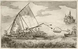![]() Parte de un grabado de Willem Schouten (grabado de Mattheus Merian de la obra de Johann Ludwig Gottfried, Historia Antipodum oder Newe Welt (1631)) | ||