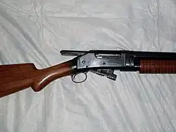 - Se cubrió la parte superior del cajón de mecanismos, por lo que la eyección del cartucho disparado se hacía lateralmente.[3] Esto añadió una mayor resistencia al cajón de mecanismos de la escopeta y le permitió disparar el cartucho de 2¾ pulgadas de largo sin el riesgo de trabarse constantemente.[5]