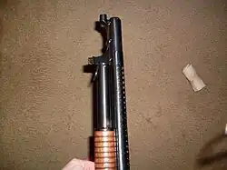 - Se instaló una guía móvil de cartucho en el lado derecho del portacerrojo para evitar la caída del cartucho cuando la escopeta era puesta de lado al momento de recargar.[3]