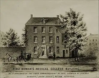 El Woman's Medical College of Pennsylvania (WMCP) (Colegio Médico Femenino de Pensilvania) fue fundado en 1850 y fue la segunda institución médica en el mundo establecida para capacitar a mujeres en medicina para obtener el título de MD. El Colegio Médico Femenino de Nueva Inglaterra se había establecido dos años antes, en 1848. [1] Originalmente llamado Colegio Médico Femenino de Pensilvania, el colegio cambió su nombre en 1867 a Colegio Médico Femenino de Pensilvania. El Hospital de la Mujer asociado de Filadelfia se fundó en 1861. Tras decidir admitir hombres en 1970, la universidad pasó a llamarse Medical College of Pennsylvania (MCP). En 1930, la universidad abrió su nuevo campus en East Falls , que combinó la enseñanza y la atención clínica de un hospital en una instalación general. Fue el primer hospital construido especialmente en la nación. En 1993, la facultad y el hospital se fusionaron con la Facultad de Medicina de Hahnemann . En 2003, las dos facultades fueron absorbidas por la Facultad de Medicina de la Universidad de Drexel .