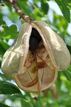 El fruto es una cápsula coriácea ovalada de 5 a 6 cm de diámetro, que se divide en tres secciones en la madurez para liberar las 6 a 18 semillas comestibles; las semillas son negras, de 1,5 cm de diámetro, parecidas a una pequeña semilla de los castaños de Indias.