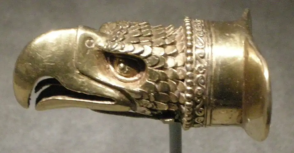 Ornamento labial en forma de cabeza de águila de la cultura mixteca-mexica, elaborado en oro, 1200-1521 d. C.