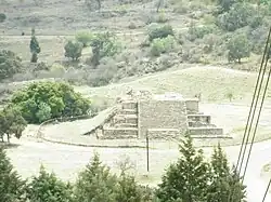 - Edificio de la Serpiente.Se construyó en el periodo formativo (700 a. C.), en la parte superior se localizó una pila monolítica de 1.30 m de diámetro con una altura de 60 cm y en su interior, una estela mutilada en la cual se aprecia la lengua bífida de una serpiente y sus colmillos.[2][6] Al norte de esta se halló una ofrenda que consistió en dos esculturas de piedra, la de un jaguar antropomorfo y un personaje masculino con cetro, bastón y también dos cajetes de barro. En la esquina noroeste del edificio se localizó una cantidad considerable de obsidiana, lo que permite suponer que se trató de un taller lítico, ya que se obtuvieron núcleos, navajillas, puntas de proyectil, raspadores, lascas y un cuchillo de sílex.[7]