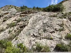- Sustrato: las icnitas se localizan sobre rocas calizas laminadas, ordenadas en finos estratos, intensamente fisurados y diaclasados, habiéndose producido en algunos sectores el desprendimiento parcial de las capas o láminas.