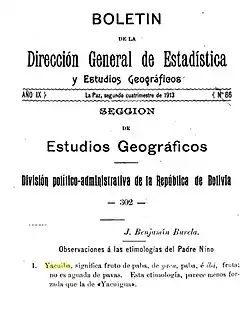 En 1913, la Dirección General de Estadísticas y Estudios Geográficos de Bolivia (actual INE), aprobó en su Sección de Estudios Geográficos División Política - Administrativa de la República de Bolivia, en base al estudio del naturalista J. Benjamín Burela, que indica la correcta traducción de Yacuiba proveniente del Chané, observando la incorrecta etimología del Padre B. Nino del mismo año de 1913, de acuerdo con Burela, Yacuiba significa: "fruto de paba" de yacu es paba, e iba es fruta. Además, afirma: "no es aguada de pavas. Esta etimología, parece menos forzada que la de Yacuigua" (Bolivia, 1913, p.302)