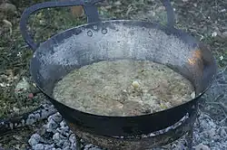- Gachasmigas: Su preparación consiste en freír los ajos en sartén al fuego, y se conservan, después se añade harina hasta cubrir el aceite y hacer una masa, a la que se le va añadiendo agua removiendo y disolviendo con el agua, se va removiendo en la sartén hasta que se consume el agua y se forme una costra. Es un plato típico para acompañar carnes asadas paralelamente como tocino, longanizas, morcillas en parrilla. Suele comerse en la propia sartén y acompañada con pan.