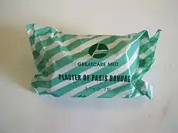 Las vendas de yeso consisten en una venda de algodón que se ha combinado con yeso de París, que se endurece después de mojarse. El yeso de París es yeso calcinado (yeso tostado), molido hasta obtener un polvo fino mediante molienda. Cuando se agrega agua, la forma más soluble de sulfato de calcio vuelve a la forma relativamente insoluble y se produce calor.
