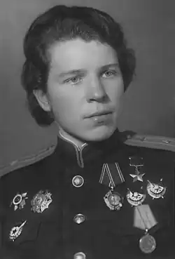 - ↑ «Никулина Евдокия Андреевна - советский военный девушка-летчик Герой Советского Союза - Красные соколы. Русские авиаторы летчики-асы 1914 - 1953». airaces.narod.ru (en ruso). Consultado el 12 de marzo de 2025.