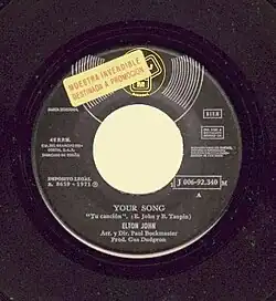 «Your Song» es una canción compuesta e interpretada por el músico británico Elton John con letra de Bernie Taupin, su colaborador habitual. Apareció originalmente en el segundo álbum de estudio homónimo de John (lanzado en 1970). La canción fue lanzada en los Estados Unidos en octubre de 1970 como el lado B de «Take Me to the Pilot». Ambas canciones recibieron difusión radial, pero los «disc-jockeys» prefirieron «Your Song» y reemplazaron a «Take Me to the Pilot» como lado A, llegando finalmente al número ocho en la lista de Billboard. La canción también alcanzó el puesto número siete en la lista de UK Singles Chart, así como la clasificación entre los 10 primeros en varios otros países.