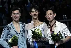 Hanyū (centro) junto a Fernández y Uno, en Pieonchang 2018.