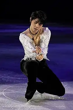 Yuzuru Hanyū (羽生 結弦 Hanyū Yuzuru?, Sendai, prefectura de Miyagi, 7 de diciembre de 1994) es un patinador japonés, doble campeón olímpico en Sochi 2014 y Pieonchang 2018 en patinaje artístico y doble campeón mundial de 2014 y 2017.[2] Ha sido campeón del Grand Prix de patinaje artístico sobre hielo desde 2013 hasta 2016,[3] y seis veces campeón nacional japonés en 2012, 2013, 2014, 2015,[4] 2020[5] y 2021. Se convirtió en el más joven ganador de los juegos olímpicos desde Dick Button en 1948, y el primer asiático en ganar el oro olímpico en patinaje masculino.[6] En 2020 ganó la final de Cuatro Continentes, convirtiéndose en el único patinador masculino solitario en la historia en ganar todos los torneos a nivel junior y senior. En la final del Gran Prix de Barcelona 2015 alcanzó el récord mundial hasta la fecha en el programa corto y puntuación total.[7] Hanyu se convirtió en el primer patinador en la historia en completar un cuádruple loop en una competición.[8] Yuzuru Hanyu es, además, el primer patinador en completar un cuádruple Axel en competición certificado por la ISU, esto fue durante su programa largo o programa libre en los Juegos olímpicos de Beijing 2022. Es el único patinador que ha ganado cuatro veces consecutivas la final del Grand Prix.[9]