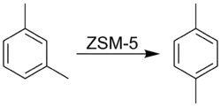 ZSM-5 tiene una alta proporción de silicio de aluminio. Cada vez que un Al 3+ catión reemplaza Si4+ catión, una carga positiva se requiere para mantener el material de carga neutra. Con protón (H + ) como el catión, el material está muy ácido. Así, la acidez es proporcional al contenido de Al. La estructura 3-D y la acidez de la ZSM-5 se pueden utilizar para reacciones catalizadas por ácido, tales como la isomerización de hidrocarburos y la alquilación de los hidrocarburos. Una de estas reacciones es la isomerización de la meta-xileno de para-xileno. Dentro de los poros de la zeolita ZSM-5, p-xileno tiene un coeficiente de difusión mucho mayor que los m-xileno. Cuando la reacción de isomerización se permite que ocurra dentro de los poros de la ZSM-5, el p-xileno es capaz de atravesar a lo largo de los poros de la difusión de la zeolita, de un catalizador muy rápidamente. Este tamaño de selectividad permite que la reacción de isomerización para producir rápidamente con un alto rendimiento.[4]