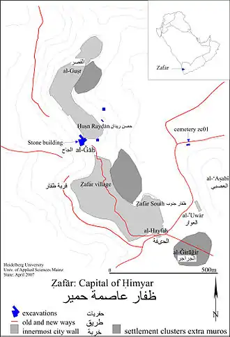 Una superficie mapeada rectangular comprende 120 hectáreas. Pero el asentamiento es de densidad desigual y más pequeño que este. Zafar es el segundo sitio arqueológico mapeado más grande de Arabia después de Marib. El asentamiento antiguo ocurre dentro y fuera de las antiguas defensas de la ciudad. Estos se han estimado en 4000 metros de largo. La fortaleza principal de hoy todavía se conoce como el "Husn Raydan". Un texto del autor medieval yemenita al-Hamdani menciona los nombres de las puertas de la ciudad, la mayoría de los cuales llevan el nombre de la ciudad a la que se enfrentan. Las principales ruinas arquitectónicas en Zafar incluyen tumbas y en el flanco sudoeste del Husn Raydan un patio de piedra cuadrado de 30 x 30 m, como se conserva, originalmente probablemente un templo, a juzgar por la acumulación de huesos de ganado que contenía. Se encuentra inmediatamente al norte de cámaras subterráneas y tumbas. Inmediatamente al norte hay una fila de cámaras de almacenamiento. Husn Raydan y al-Gusr (árabe estándar: al-Qasr) 300 m al norte fueron una vez una fortificación dentro de las murallas de la ciudad. Raydan South también fue fortificado y las fortificaciones en ruinas se conservan mejor aquí. Los textos de Musnad mencionan cinco palacios reales en Zafar: Hargab, Kallanum, Kawkaban, Shawhatan y Raydan, el palacio estatal. Los más pequeños, como Yakrub, también se mencionan. Los asentamientos cercanos del período himyarita incluyen Maṣna‘at Māriya (antiguo Samiʻān) y el asentamiento de Ǧabal al-‘Awd, a 25 km al sureste.