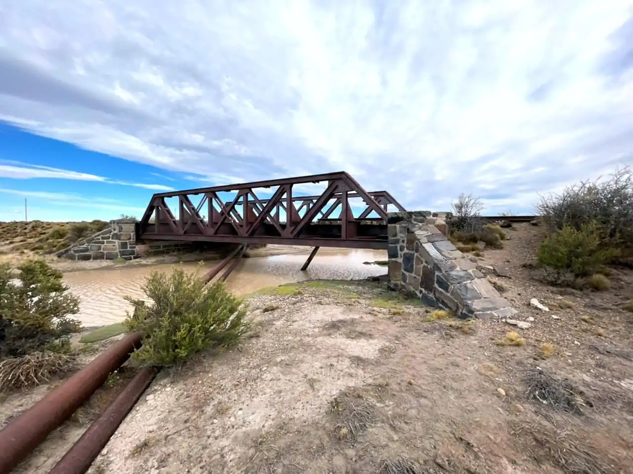 Puente ferroviario en desuso cruzando el arroyo parcialmente vandalizado.