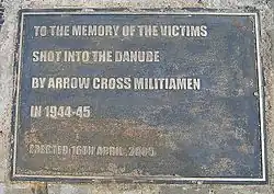 La composición titulada 'Zapatos en la orilla del Danubio' recuerda a las 3.500 personas, 800 de ellas judías, que fueron fusiladas en el Danubio durante la época del terror de la Cruz Flechada.[2]​ El escultor creó sesenta pares de zapatos de hierro apropiados para la época. Los zapatos están sujetos al terraplén de piedra, y detrás de ellos hay un banco de piedra de 40 metros de largo y 70 cm de alto. En tres puntos hay carteles de hierro fundido con el siguiente texto en húngaro, inglés y hebreo: "A la memoria de las víctimas fusiladas en el Danubio por milicianos de la Cruz Flechada en 1944-45. fue erigido el 16 de abril de 2005"[3]