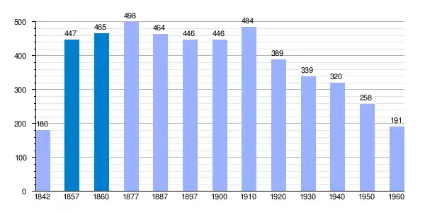 | Gráfica de evolución demográfica de Zayas de Torre[7] entre 1842 y 1960 |
