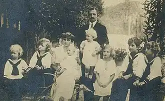 Zita, sentada en el extremo derecho, con sus padres y diecisiete de sus hermanos, 1906. -