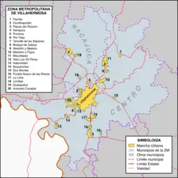La Zona Metropolitana de Villahermosa, según datos del INEGI en 2005, se localiza en la parte central del estado mexicano de Tabasco y está conformada oficialmente por 2 municipios, dichos municipios son: Centro (en el cual se localiza la ciudad de Villahermosa) y el municipio de Nacajuca.[2]