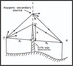El efecto de filo de cuchillo o difracción de bordes se puede determinar con el principio de Huygens-Fresnel. En la propagación electromagnética se trata de un re-direccionamiento causado por la difracción de las ondas de radio al golpear sobre colinas, edificaciones u otro obstáculo cuyo ángulo es agudo. Aunque el cálculo de estas pérdidas en terrenos irregulares es un problema matemático complejo, se han realizado diferentes expresiones para las pérdidas de difracción en casos simples. Cuando la difracción es causada por un solo objeto, como una colina o edificación, la atenuación (perdida de potencia) causada por la difracción se puede estimar tratando la obstrucción como un filo de difracción. Este es el más simple de los modelos, y la pérdida de difracción en este caso se pueden estimar fácilmente utilizando la solución de Fresnel clásica para el campo detrás del filo de un cuchillo. La figura 3. ilustra este enfoque.[2]