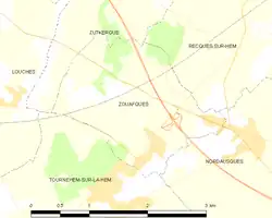 Zouafques se encuentra a 18 km al noroeste de Saint-Omer, en el cruce de la carretera D217 con la autopista A26, en el valle del pequeño río Hem.