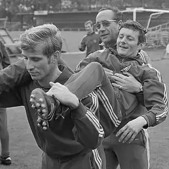 ![]() Zvezdan Čebinac llevado por su compañero Fritz Popp y su entrenador Max Merkel en 1968 | ||